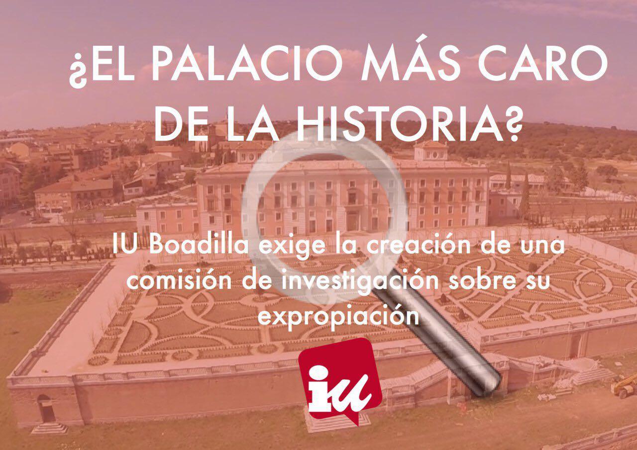 La asamblea local de IU en Boadilla ha remitido una petición a los grupos políticos del ayuntamiento para la creación de una Comisión de Investigación sobre el acuerdo por el que fue expropiado el Palacio de Boadilla. IU ha dado traslado de esta propuesta a todos los grupos municipales que considera legítimamente constituidos.